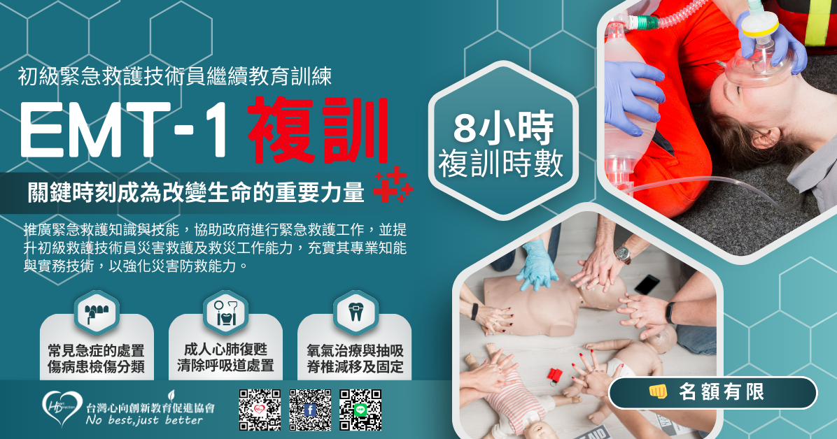 5.受訓資格依救護技術員管理辦法第2條規定,相當初級中等以上學校畢業或具同等學力,或其他經衛生福利部認可單位訓練合格之初級救護技術員,並且EMT1合格證書在有效期限內,報名時須檢附EMT1合格證書查驗。